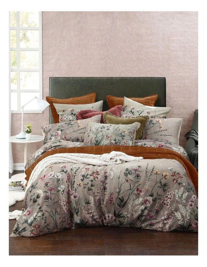 Neutral tones with a touch of blush, Carrie is a beautifully intricate floral print of meadow flowers on cotton sateen.