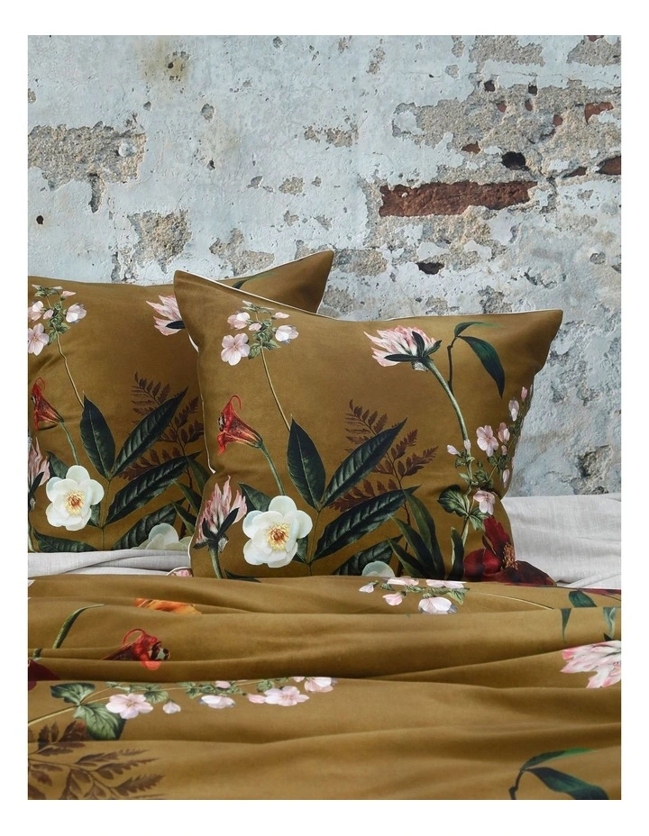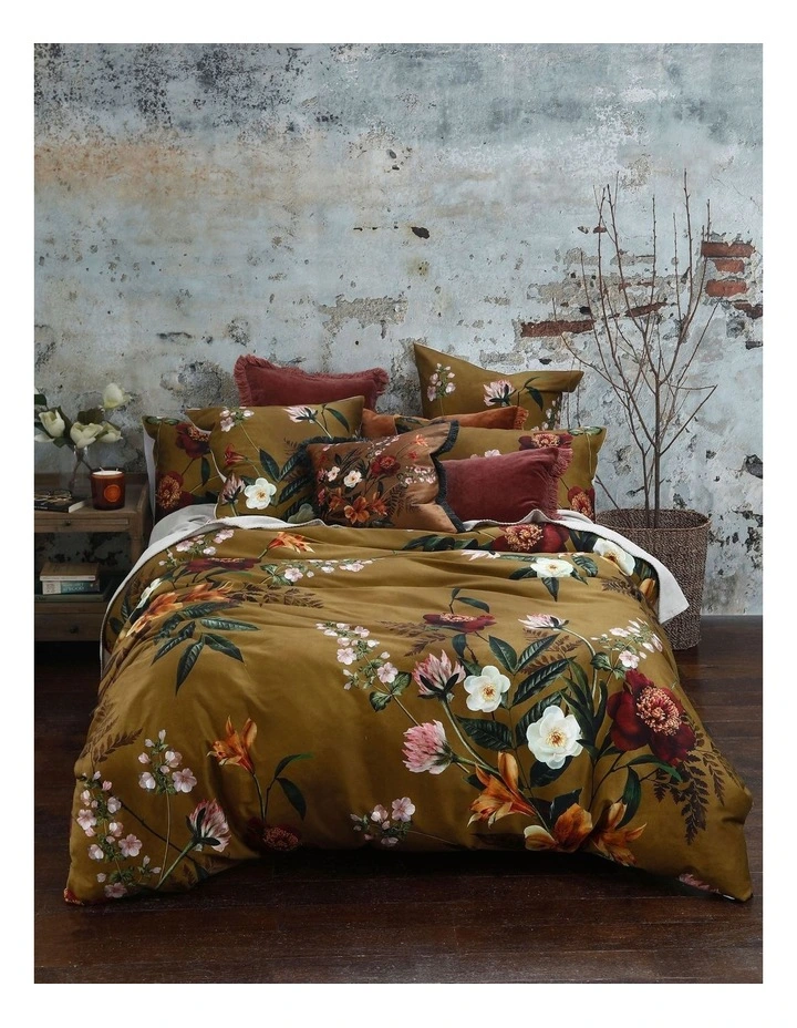 Depicting hand-painted bunches of garden flowers in a distinctively warm palette, Isola enjoys a 300 thread, cotton sateen ground in mustard.