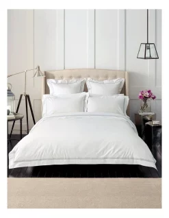 Palais brilliant white 1200 thread count, spun from superior long staple fibres, creates a lustrous sateen weave for luxuriously soft, next-to-skin comfort. The generous borders are trimmed with Palais trademark triple stitched embroidery, available in a range of designer colours. Create a stunning bed of tailored simplicity with Palais.